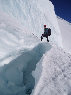 Crevasse obstacles and objective dangers - note that snow bridges fail in warm weather